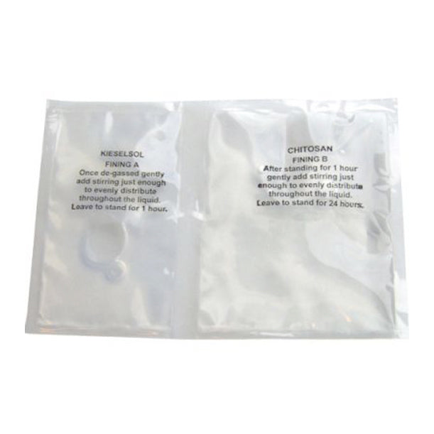 Two stage clarifying agent. First, stir in Kieselsol, then 24 hours later stir in Chitosan.